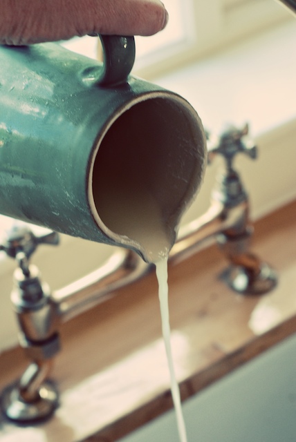 I used this natty invention of a jelly bag suspended by some clips inside a Denby jug.