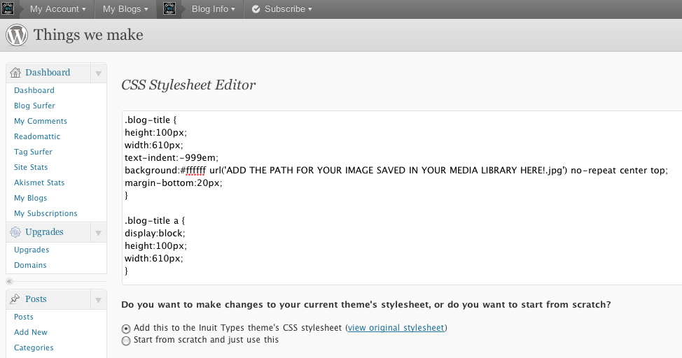 Tagged: advice, blog, css, custom, customisation, featured, header, Help, image, inuit, issues, logo, photo, showcase, stylesheet, theme, types, wordpress
