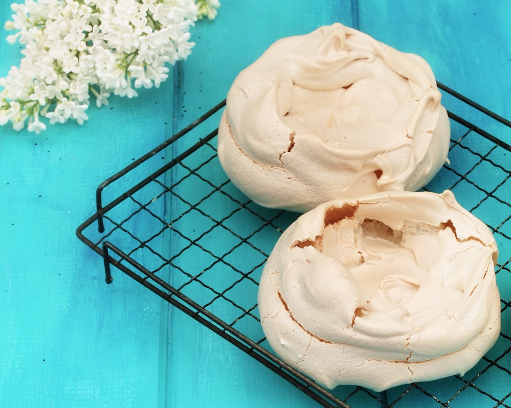 Whisk 4 egg whites with a pinch of salt until they hold firm peaks, then whilst still whisking, very gradually add 250g of golden caster sugar. The golden sugar is what gives them their soft apricot colour and a lovely light toffee flavour.