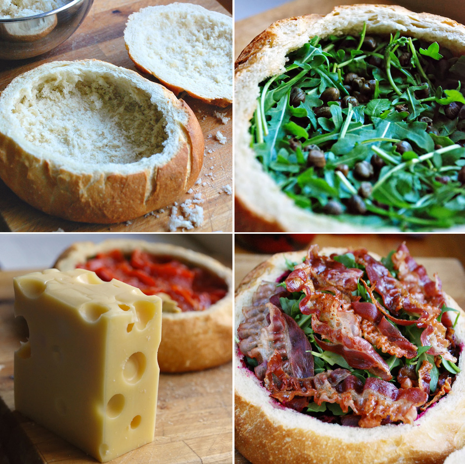 • Maybe start with a layer of rocket and a handful of salty capers, some sunblush tomatoes, olives, slices of salami and cheese, some peppers or artichoke hearts from a jar.