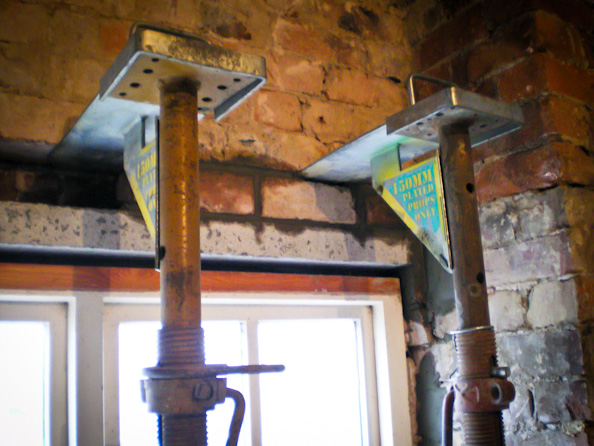 About 25 years ago there was a fire in the attic, which neighbours have recounted to us as belching from the window on the Eastern gable. When I removed the plaster I found that the timber lintel had been damaged, but instead of replacing it properly whoever did the repairs just cut away the damage and nailed in a bit of timber to fill the gap. Being an upstanding member of the construction profession I had to make things right with some temporary props while I installed a new concrete lintel.
