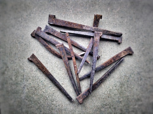 Not all the finds have given me such joy; I’ve found leaks, rot and woodworm in various places. In replacing some floorboards that were beyond repair I snapped a shot of this pile of handmade cut nails. 110 years ago these would have been individually hammered out by Nailers in the nearby town of Belper.
