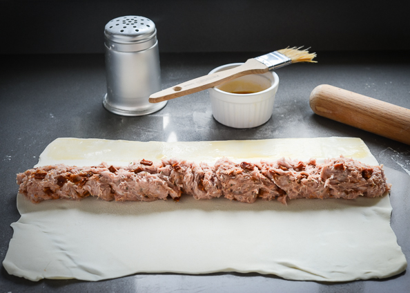 - Squeeze the filling into sausage shapes and spread along the pastry