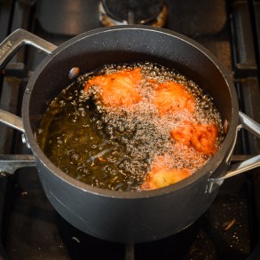 - Drop heaped teaspoons of mix into the oil, 4 at a time.