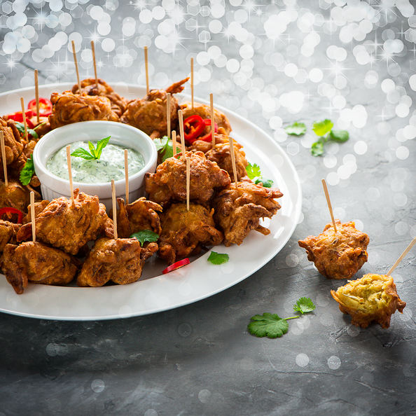 Freshly made onion bhajis are a great option and easier than you’d think. I can’t be held responsible for you eating a dozen of these in one go, so mind how you go. For my money it’s worth the extra effort of salting the onions to make them super crispy. I make these bite-sized for pronging with a cocktail stick and dipping in mint and yoghurt.