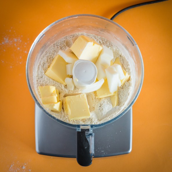 Mix the flours and icing sugar then lightly rub in the butter and lard – the best way to do this is to whiz it briefly in a food processor.