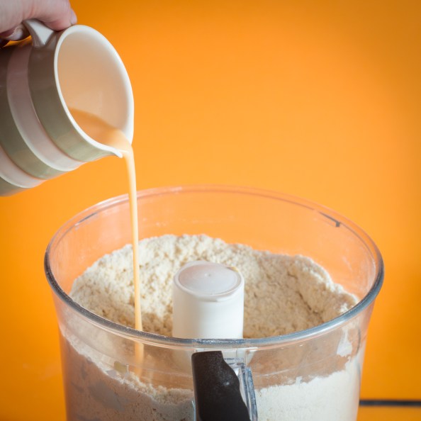 Add most of the milk/egg mixture and stir or pulse until it starts to come together.