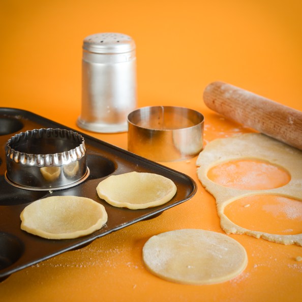 Roll out pastry on a floured surface until it’s around 4mm (the thickness of a pound coin)