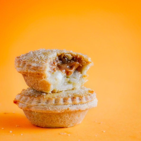 My perfect apple pie has a mix of soft, tangy Bramley’s, which cook down into a rich apple sauce, then little cubes of a crisper eating apple to add a bit of bite. I am not professing that these are the best apple pies ever, but the addition of a spoonful of dulce de leche*, to give them a gooey caramel layer, does make them exceedingly good.