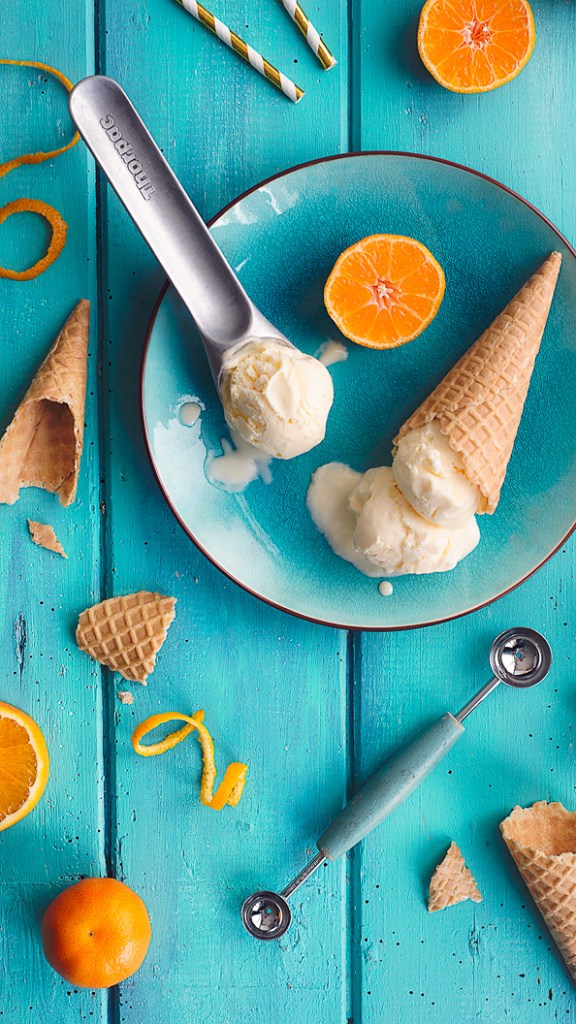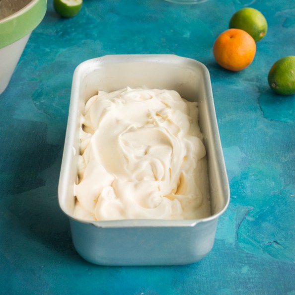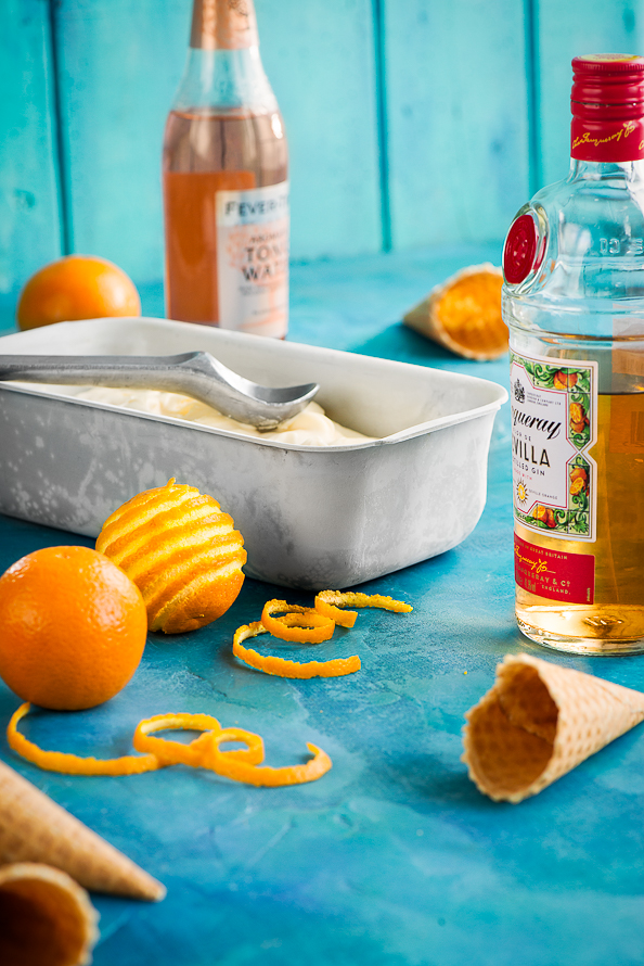 I use a Seville orange flavoured gin and the pretty aromatic Fever Tree tonic but you can use any combination of gin and tonic. The alcohol stops the cream from setting too firmly, so it’s nice and soft to scoop, and the fizz from the tonic and the whipping keep it light and a bit tingly on your tonguely. Add your favourite citrus juice. I opted for a mix of orange for sweetness and lime for tang.