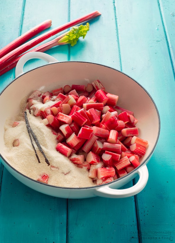 Put the chopped rhubarb in a shallow oven proof dish, sprinkle on the sugar and add the vanilla. Cover with foil and bake at 180º degrees c for around 25-30 minutes. Cooking it this way keeps the pieces whole and stops it being stringy. Leave the pieces to cool in the syrup before you drain it to help the colour to develop. When it has cooled drain the juice into a jug .