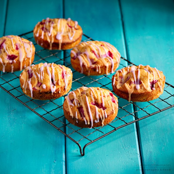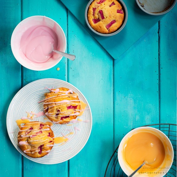 But then there are my favourite retro Rhubarb & Custard Cakes. They have a spoonful of custard powder added to a basic cake batter, which makes them vanilla rich and golden. Then they are topped with freshly roasted, vanilla-y rhubarb. To double up the flavour I add two drizzle icings, one with syrup from the rhubarb and the other with a bit of custard powder, or vanilla.