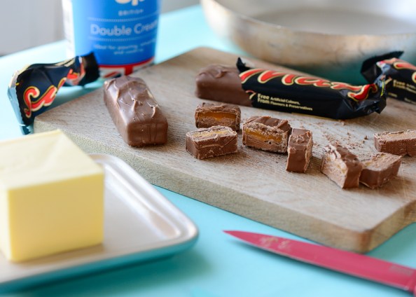 For Mars Bar Sauce chop up the Mars Bars and melt then in a small pan over a gentle heat with the cream and butter. Keep stirring or whisking and eventually then will form a glossy thick sauce.