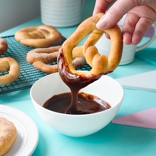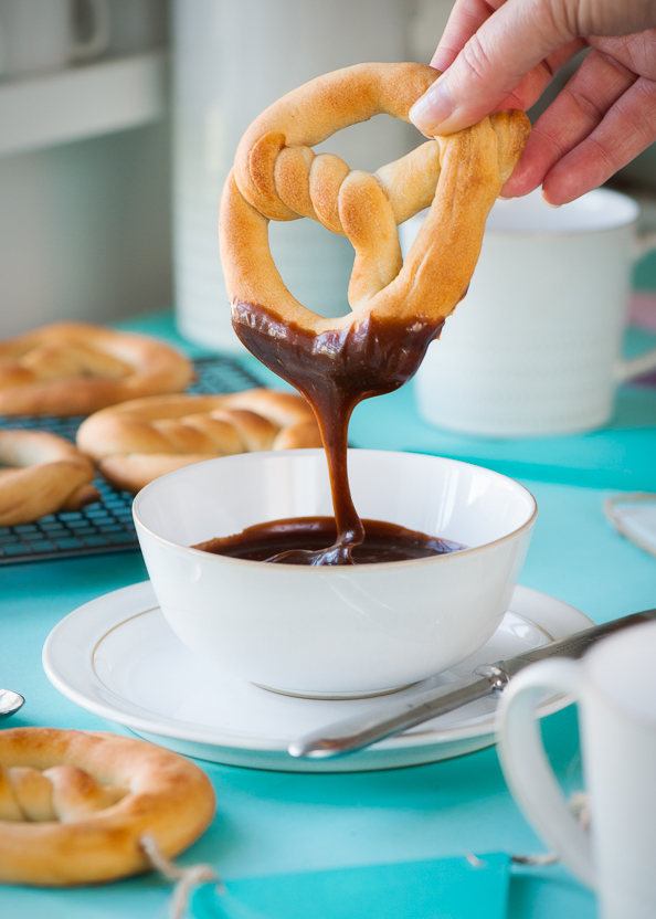 My favourite pretzel will always be brushed with butter and dipped in cinnamon sugar, but here I offer up a ridiculous chocolate caramel sauce made from melted Mars Bars.