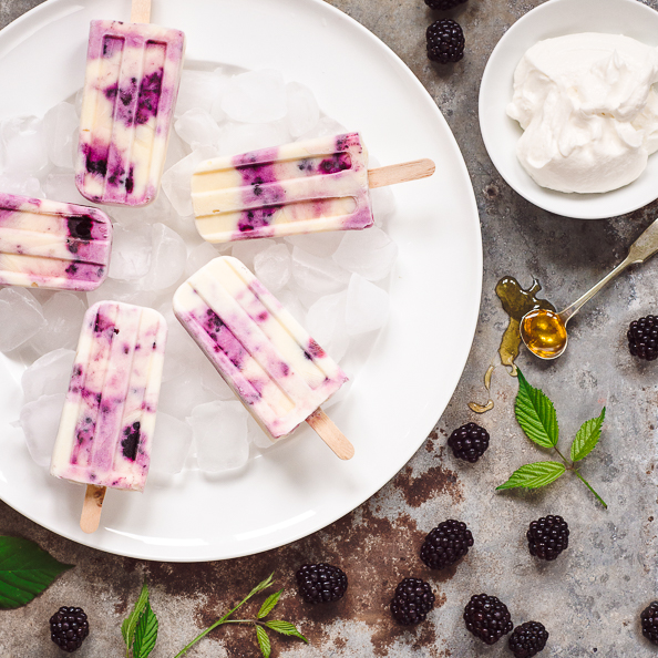 Spoon alternate dollops of the blackberry yoghurt with the plain honey yoghurt into your moulds, swirling a little as you go.
